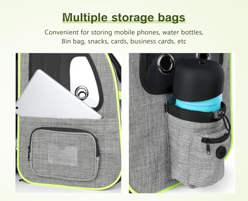 犬の飛び出し防止のためのリーシュコードも付属しています。それと、リードなどの小物が入るサブポケットが付いています。横面には水筒やペットボトルが収まるポケットが付いています。